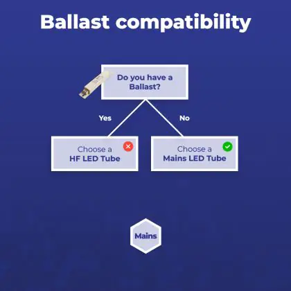 Un ballast (reattore) può essere visto come un regolatore di energia che accende l'apparecchio luminoso. C'è uno starter nell'apparecchio? Allora ci sarà anche un ballast convenzionale (EM). Gli apparecchi con un ballast elettronico (HF) non hanno uno starter. Si può paragonare un driver LED a un reattore elettronico, ma funziona solo con l'illuminazione a LED.