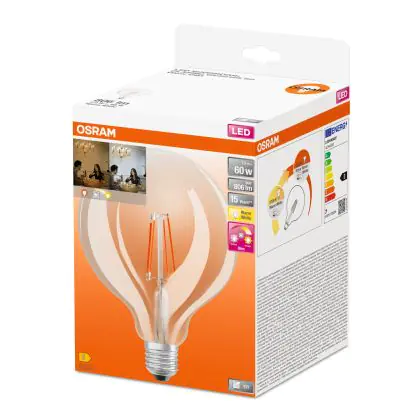 La Osram SuperStar LED E27 Globe 125mm Filamento Chiara 7W 806lm - 822-827 Dim to Warm | Dimmerabile - Sostitutiva 60W è la perfetta sostituzione per la tua lampada convenzionale 60W con attacco E27 grazie alla sua tecnologia LED. Passare a LED ti offrirà tanti vantaggi!