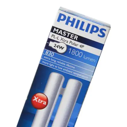 Le Philips PL-L Xtra Polar 24W 830 4P (MASTER) sono lampade fluorescenti compatte veramente efficienti dal punto di vista energetico in quanto consumano poca energia e sono caratterizzate da una vita media incredibilmente lunga di 36.000 ore (quasi doppia rispetto alle lampade corrispondenti della linea Philips PL-L Polar classica). La base di queste lampade fluorescenti a basso consumo é del tipo 2G11 a 4 pin (perni). La potenza delle medesime é pari a 24W. Esse sono state progettate per operare in aree a basse temperature come specificato di seguito. Quando decidi di sostituire le tue vecchie lampade fluorescenti compatte, é di estrema importanza mantenere medesima base, numero di pin (perni) e stessa potenza: se anche uno solo di questi parametri é differente dalle tue lampade originali, con tutta probabilità non riuscirai a procedere con l'installazione.