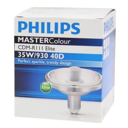 Le Philips CDM-R111 Elite 35W 930 GX8.5 40D (MASTERColour) sono lampade a scarica compatte note per la qualità della luce emessa (una luce bianca brillante). Rispetto alle lampade Philips CDM-R111 presentano una migliore resa dei colori e una più lunga durata. Queste lampade hanno una potenza pari a 35W e presentano un attacco del tipo GX8.5. Presentano una vita media pari a 12000 ore. L'indice di resa cromatica di tali lampade a scarica compatte si assesta nell'intervallo di 90-100Ra: questo indica che i colori e le caratteristiche degli oggetti illuminati vengono esaltati incredibilmente.