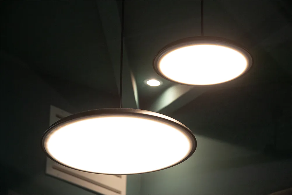 Per creare la giusta atmosfera con la luce abbiamo scelto apparecchi di Noxion e Nordlux, ma abbiamo anche deciso di far realizzare apparecchi su misura per il cliente. Creare un'atmosfera piacevole in ufficio, che contribuisca a far sì che i dipendenti si trovino bene in ufficio e li incoraggi ad andarci il più possibile. L'ufficio doveva anche avere un aspetto lussuoso, cosa che abbiamo cercato di trasmettere con i complementi d'arredo.